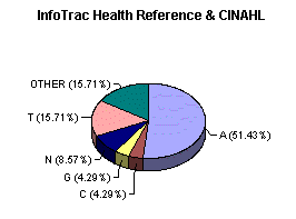 InfoTrac contains 68 full-text titles that are also indexed in CINAHL. This represents 6.40 percent of the titles in this database. The distribution of publications types in InfoTrac includes 51.43 percent academic, 15.71 percent trade, 8.57 percent newsletters, 4.29 percent government publications, 4.29 percent consumer, and 15.71 percent miscellaneous.