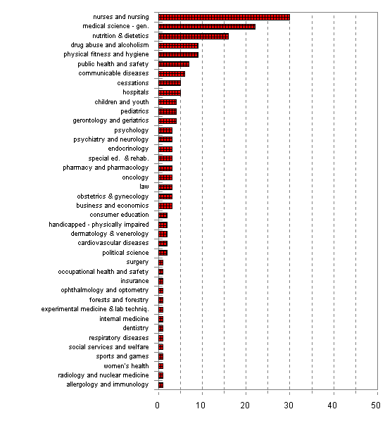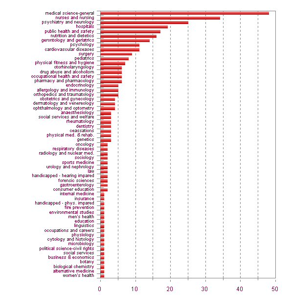 Tables 4a-b compare the number of serials indexed by Ulrich's subject headings in these two databases. According to our analysis, of all the periodicals ProQuest contains, we found the largest number under the following Ulrich's subject headings: medical sciences - general, followed by nurses and nursing, psychiatry and neurology, hospitals, public health and safety, nutrition and dietetics, gerontology and geriatrics, and psychology. Of all the periodicals InfoTrac contains, we found the highest number of titles under the following subject headings: nurses and nursing, medical sciences - general, nutrition and dietetics, drug abuse and alcoholism, physical fitness and hygiene, and public health and safety.